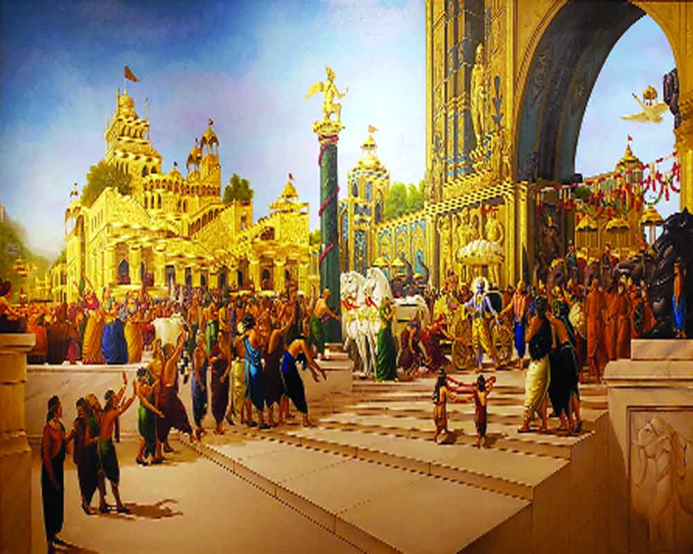 From the majestic portrayal of Lord Krishna’s return to the city of Dwarka after the victory in Mahabharata to the meditative contours of Buddha and Shiva, Delhi-based artist Raghu Vyas’ canvas brings to life a variety of gods and goddesses from our epics and mythology. Known for his unique style popular in the art circles as contemporary imaginary realism but firmly rooted in the Basholi school of miniature art, Vyas is now showing 15 such resplendent oils on canvas in a solo exhibition titled Melange: The Art of Raghu Vyas at the Shridharani Art Gallery.