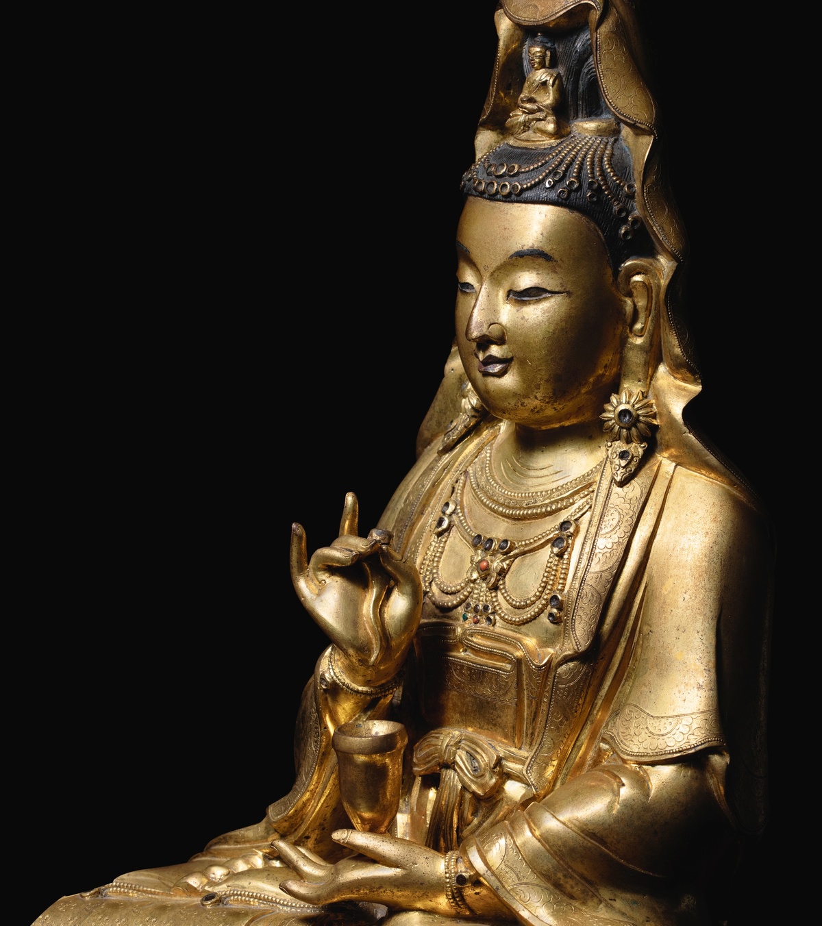 The deity is cast here in a sinicized style, evident through the rounded fleshy face, feminine features, fuller figure, and cowl draped over the tall chignon. This form of representation developed in the mid to late Ming dynasty and continued into the early Qing, before gilt-bronzes generally adopted a more Tibeto-Chinese manner. This lot carries an estimate of US$200,000-300,000.