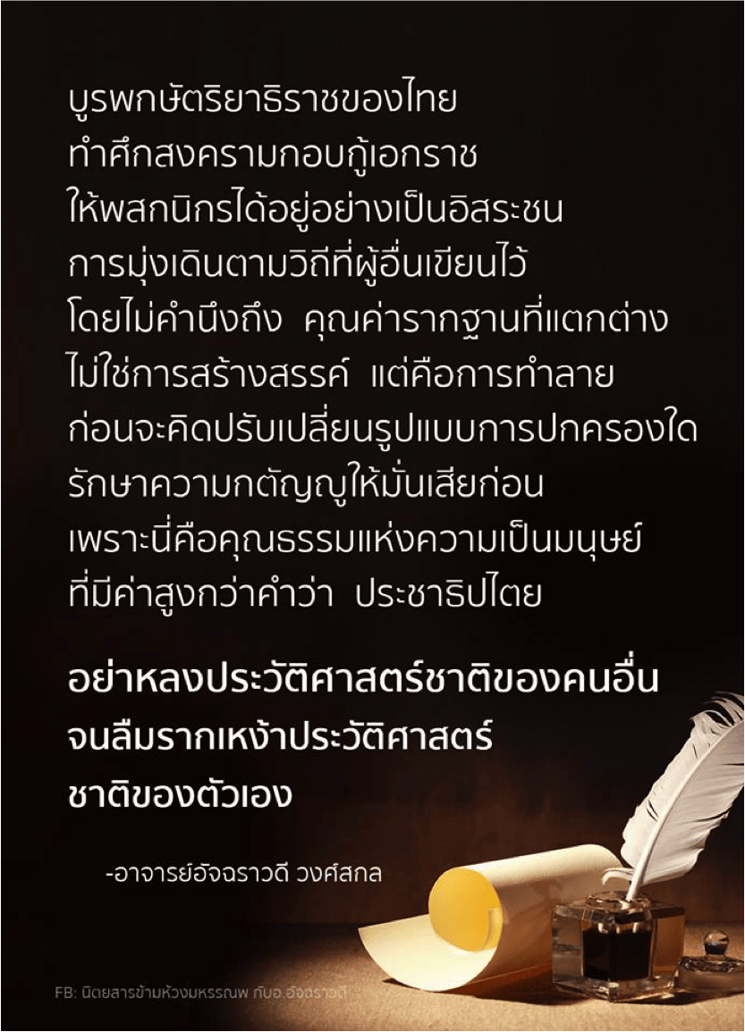 บุคคลต้องมีความกตัญญูต่อชาติ ศาสน์ กษัตริย์ ที่ให้โอกาสได้มีที่พักอยู่อาศัย ได้พึ่งพระบารมี ให้เราเป็นคนผู้มีศักดิ์ มีสิทธิ์ ไม่แพ้ชนชาติใดในโลก อย่าหลงลืมประวัติศาสตร์ ลืมที่มาที่ไปของบรรพชนของเราเอง รักษาความกตัญญูให้แนบแน่นในหัวใจ