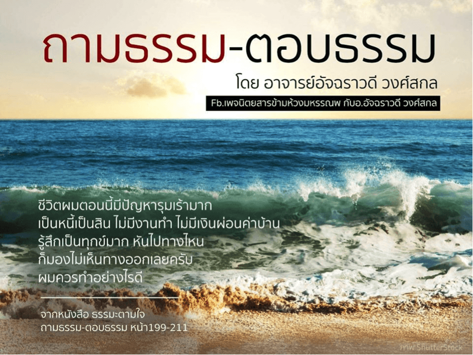 1. ชีวิตผมตอนนี้มีปัญหารุมเร้ามาก เป็นหนี้เป็นสิน ไม่มีงานทำ ไม่มีเงินผ่อนค่าบ้าน รู้สึกเป็นทุกข์มาก หันไปทางไหนก็มองไม่เห็นทางออกเลยครับ ผมควรทำอย่างไรด